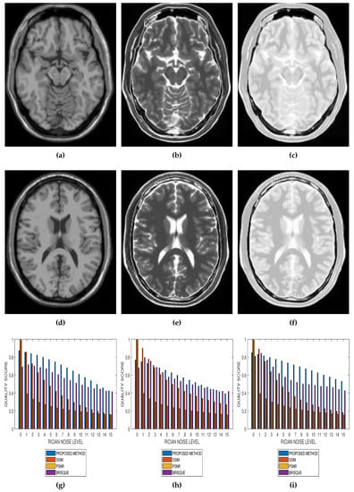 Comparative performance evaluation of the proposed method with SSIM, PSNR and BRISQUE quality metrics using 15 slices in (a,d) T1, (b,e) T2 and (c,f) PD simulated MRI volume data from McGill University BrainWeb (g–i).