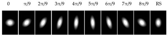 Note that a, b and c are functions of scale and orientation θ of the Gaussian kernels [,]. By changing the scales and the orientation, a set of gLoG kernels can be obtained. In this paper, we generate gLoG kernels with ranging from 6 to 12 insteps of 0.5 and nine orientations . The nine gLoG filters corresponding to nine orientations are generated by adding up gLoG kernels of the same orientation, but with different scales. Special kernels, whose are rotational symmetric and their structures are independent of the orientation, are summed separately to form a rotationally symmetric gLoG filter. In this paper, 10 gLoG filters are used (see Figure 5), with nine filters of different orientations and one rotationally symmetric (RS) filter. A total of 10 response maps, with one response map from each gLoG filter, are generated.