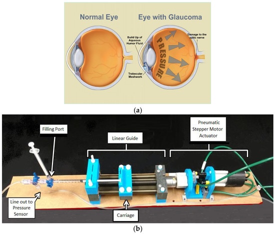 (a) The effects of glaucoma illustrated [11]. (b) A broadly labeled image of the microinjector system setup with syringe.
