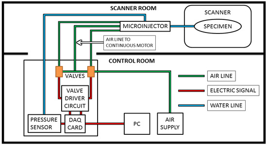For this study, the computer is placed in the control room along with the control box, which contains the DAQ card, valves, valve driver circuit, and up to 5psi 2% accuracy pressure sensor (SSCDANT005PGAA5, Honeywell, Golden Valley, MN, USA). The microinjector is attached to a pole located just outside the bore of the MRI, and pneumatic tubes about 3 m long were inserted through the waveguide. The length of the tubing is short enough to cause hysteresis to be negligible, especially given the small amounts of liquid injected for each step and the relatively slow speed. Steps were taken to ensure that no air bubbles were present, and none appeared during the testing as the pressures were low and the tubing was a closed system. In addition, the pressure sensor allowed for control based on feedback, which could allow for longer tubing if needed. The injection line itself measured at approximately 1 m and the specimen was located at the center of the bore. The pressurized air is supplied by an air compressor located in the control room, as illustrated by Figure 2, which illustrates the overall layout schematic for the system.
