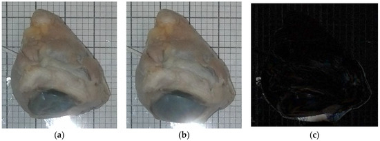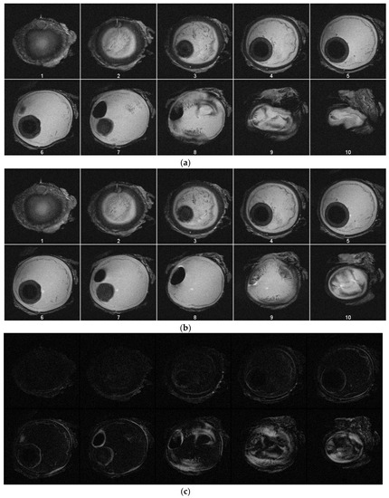 Figure 3a,b are images taken from one of the experiments using the camera and a 10 mL syringe. One specimen was used for testing under MRI. Although some changes in the eyeball’s structure are readily apparent, subtle changes in size were identified by taking the images’ absolute difference using MATLAB’s basic image processing toolbox (Figure 3c). Figure 3a (t = 0 s) had 0 mmHg, and Figure 3b had 100 mmHg after 535 s of continuous water injection (1.75 mL total).