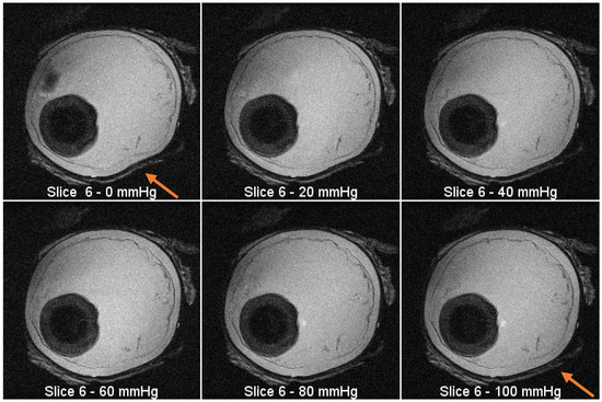 MRI images from the same slice (plane) at increasing pressure intervals. There is visible expansion in the outline of the eyeball as the pressure increases (see arrow location).