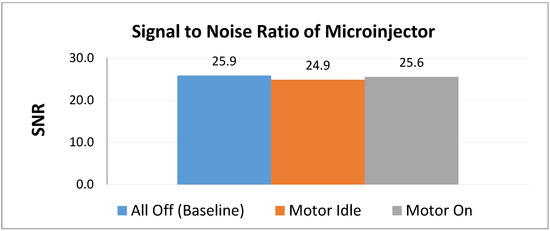 Figure 6 shows a comparison of the signal to noise ratios generated by each condition. Table 2 shows the comparison of SNR and reduction. On average, the control produced an SNR of around 25.9. With the system powered on and the motor idle, the SNR is approximately 24.9, a reduction of about 3.83%. When the motor is running, the SNR is approximately 25.6, resulting in a reduction of approximately 1.24%. It is expected that when the motor is running that a greater SNR should manifest compared to when the motor is idle. Each condition showed less than 10% deviation from the control SNR, which is determined to be acceptable [14,17].