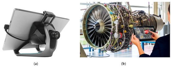 Tablet-based interface equipped with a camera for visual inspection. (a) the tablet-based interface equipped with a camera (b) the tablet-based handheld interface used by an operator for the inspection of an aircraft engine