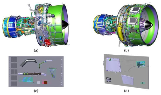 Some of our CAD models: (a,b) aircraft engine, (c,d) two testing plates with several elements.