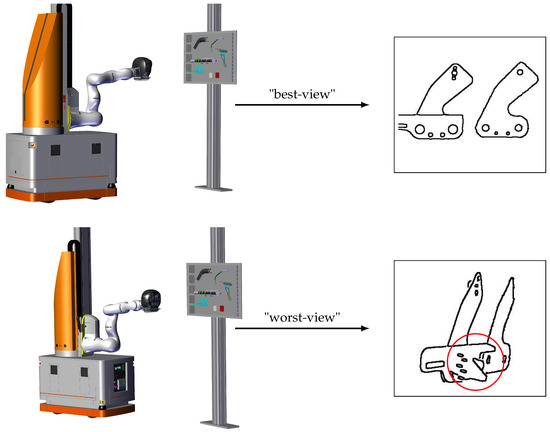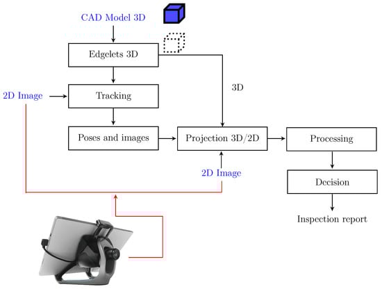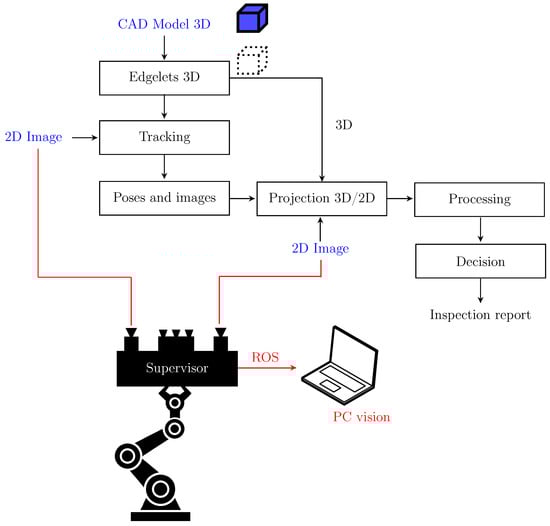 After the offline process of viewpoint selection is completed, the robotic inspection system is ready for operation. Comparison of acquired 2D or 3D data with the CAD model is a fast-growing type of inspection. In fact, it is the only effective and precise method of inspection, because the model contains an exact specification of the part [13] and provides a rich and useful source of information. In early works, Newman et al. [14] presented automated visual inspection (AVI) and techniques that have been reported in the literature from 1988 to 1993. They especially focused on the expanded role of CAD models in many systems of inspection. Jovancevic et al. [15] show that utilizing CAD model whenever possible is beneficial for their results in the task of exterior aircraft inspection. Viana et al. [16] have presented a CAD-based inspection of mechanical parts by means of comparison between a reference and a test image. The CAD-based matching method compares an image generated from a CAD model with an image acquired with the 2D camera, using primitives extracted from the contours. Berndt et al. [17] present a new technique for the detection of assembly errors using virtual images created from the CAD model. Their software compares a virtual image with the image of the real component. VisionLib, developed by the Fraunhofer IGD, combines the strengths of real-time object localization, live comparison against CAD data, and augmented reality for inspections and virtual measurements. It offers augmented reality-based stationary and mobile inspection systems for quality control. Image processing and a CAD-based approach have been also applied to the shipbuilding inspection task [18].