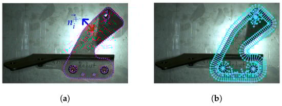An edgelet, , is defined as a 3D point, , and a normalized direction vector, , of the edgelet. These points, , represent the 3D contour points of an object, see Figure 8. The edgelets are extracted offline by rendering a CAD model, as explained in [22]. The edgelets has been used in other works, see, e.g., in [23,24,25].