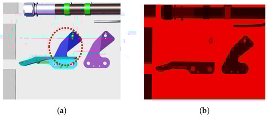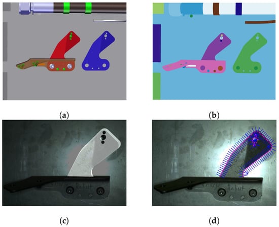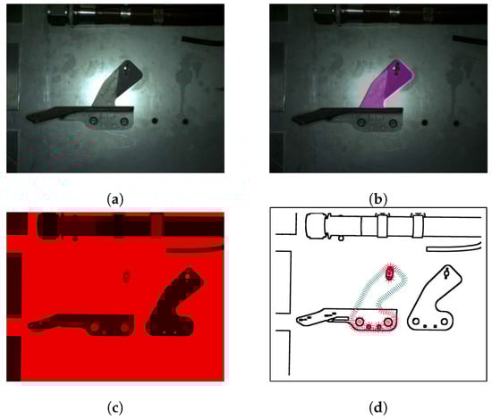 Occlusion handling by rendering using Color Rendering Index (CRI): (a) CAD model rendered with CATIA composer, (b) CAD model rendered using CRI, (c) mask generated using CRI render, white areas represent region to be inspected, and (d) filtered edgelets (Figure 11d) projected inside the region of interest specified by the generated mask.