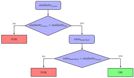 Experimental results for determining the optimal . The red horizontal line represents the min matched ratio in the case OK (element in green) and the max matched ratio in the case NOK (element in red).