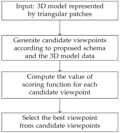 In this work, the starting point is a 3D CAD model of an assembly to be inspected. The first step is offline viewpoint selection, which is performed per object to be inspected. In the computer vision community, the viewpoint selection has been investigated. Examples are optimal 3D object recognition [6], grasp detection [7], human actions recognition [8], visual search [9], or global 3D reconstruction [10]. The problem of viewpoint selection is defined as generating candidate viewpoints and constructing scoring function for finding the best viewpoints with the highest score as presented by Liu et al. [11]. For reducing the search space, many authors use an approximate sphere [12] or a cylinder to generate the candidate viewpoints [11]. In our work, the candidate viewpoints are sampled over a sphere, therefore each viewpoint is at a safe distance from the center of mass of the element to be inspected, so as to comply with industrial security standards for ensuring the security of the inspected element as well as of the inspecting robot.