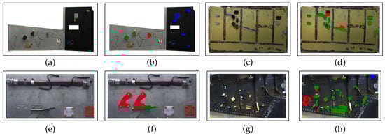 Dataset used to evaluate our algorithms: (a,c,e,g) real images and (b,d,f,h) corresponding inspection results with OK elements in green and NOK elements in red.