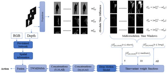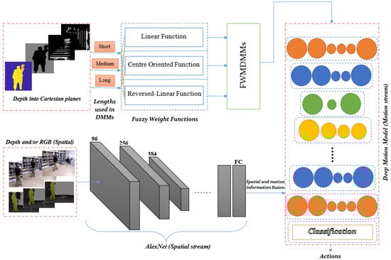 - In order to learn information in the temporal dimension with diverse applicability, we develop a novel spatial temporal deep learning model. It includes a new method that improves traditional depth motion maps (DMMs) [,] called fuzzy weighted multi-resolution depth motion maps (FWMDMMs). The FWMDMM includes a number of different temporal model instances. These are used to help overcome the inherent variability in time associated for each individual action. Furthermore it can help overcome difficulties with self-occlusions and actions that might have similar types of movements.