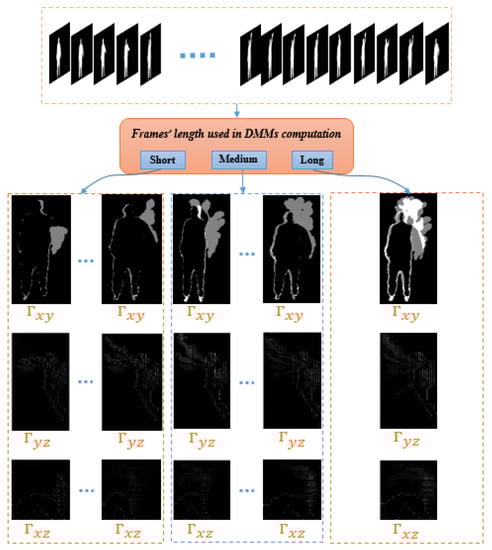 In our work, the depth sequence is split into three different groups where each has a different time interval. This means, various values of the threshold, , formulated to generate MDMMs for the same action (depth sequence). As ∈ in traditional DMMs, this can be improved by ∈ where ∈. This extension enables different temporal windows to properly cover an action’s motion regardless of whether it carries important information over a short or long duration. Each of these three durations produce a different DMM. The values of are selected to cover short, intermediate and long durations. For long, this would typically correspond to an entire depth sequence for the various video sequences considered here. Figure 2 illustrates the computational procedure for MDMMs.