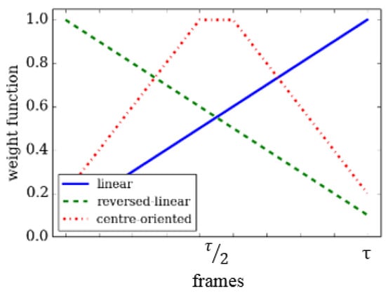 Let be the linear weight that is given to frame t with values in the range between . This can be improved for DMMs by replacing the with three fuzzy weight functions. Each has the same range based weighting approach. This helps to emphasise salient aspects in time of an action sequence. The three weight functions provide three different weight formulations for frames in the same DMM template. The result is three different DMM representations. These fuzzy functions can assign importance to the motion information in frame t using three linearly varying functions. The functions are: linear function, reversed linear function and central-oriented function. Figure 3 and Figure 4 illustrate the fuzzy weight functions and the resulting effects on the DMMs ( is considered in the figure).