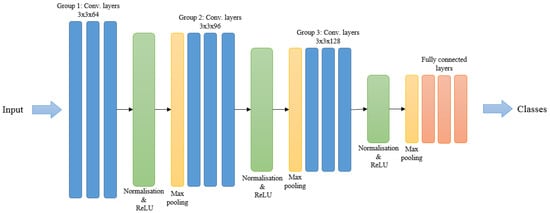 The convolutional layers constitute three groups in the network. Each has three convolutional layers, separated by normalisation, ReLu and max-pooling layers. The specifications of the later three layers are the same after each single group in the network. The specification of the convolutional layers are varied according to group stage. The hand-crafted (FWMDMMs) information proposed in Section 3.1 forms the input to the motion model. This starts at the first group of convolutional layers and filtered with 64 kernels of size 3 × 3 each. Next, the output of the third convolutional layer in the first group is fed into the normalisation and max-pooling layers. These have pool size [2, 2] and stride [2, 2].