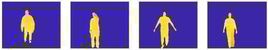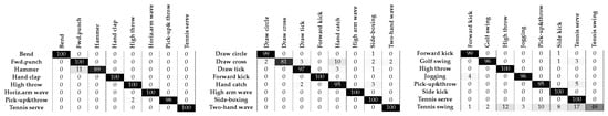 The work differs from work in (e.g., [,]). For instance, for the DMM computation, overlapped segments were used in the calculation of a Multi-resolution DMM (MDMM). This means redundant information is included. For the work presented here, non-overlapped segments are used. This saves processing time for the MDMM calculation. Moreover, the weight functions of paper [] are just incremental weights. For the work here, different weight functions are used. These enhance a number of different important aspects of an action sequence including incremental, decremented and middle weight functions.