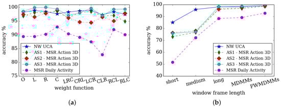 It can be seen in Figure 11a that using FWMDMM based on different weight functions can significantly improve the recognition rate. It appears that most of the weight functions have helped to achieve better recognition rates in comparison with the original MDMM. For instance, it can be seen that the centre-oriented weight function achieves improved results. This is in terms of MSR daily activity, AS1-MSR action 3D and AS2-MSR action 3D datasets compared to other weight functions and the original MDMM. A reversed linear weight function appears to achieve the best performance in terms of NUCLA and AS3-MSR action 3D datasets. This is in comparison with other weight functions and the original MDMM.