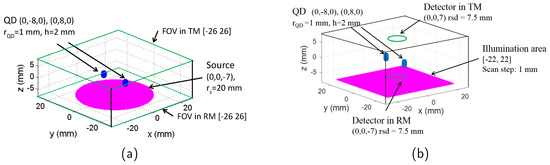 Simulation geometry of (a) full-field illumination system and (b) scanning system. FOV: field of view; TM: transmission mode; RM: reflection mode; QD: target containing quantum dots.