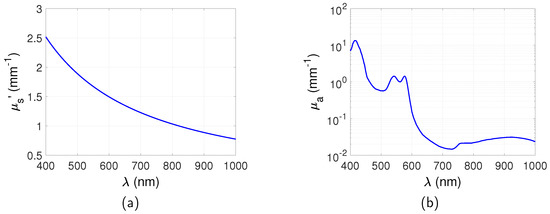 It can be seen from Equations (2) and (3) that and are a function of the wavelength. Simulation of the excitation and emission wavelength of the targets is therefore through a corresponding calculation of the reduced scattering coefficient and absorption coefficient. This is an ideal wavelength filtering situation that only the emitted light is detected from the QDs. and used in these simulations were obtained based on Equations (2) and (3) and are shown in Figure 2. , , , [22]. and are obtained from the authors of [23]. Only blood component is considered for between 400 nm and 1000 nm as this is the dominant absorber in this wavelength region. Water may become dominant over blood at wavelengths longer than 1000 nm but is much lower between 400 nm and 1000 nm [22] and is neglected in these simulations. Similarly the absorption of fat and melanosome is low in this range and is neglected [22].