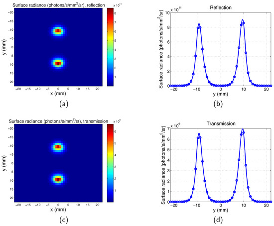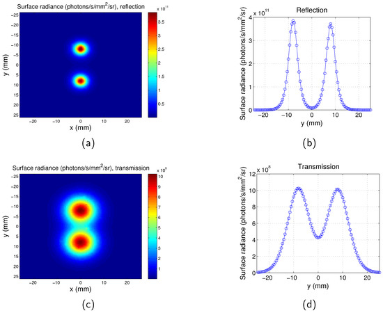 Similarly, the surface radiance distribution for the scanning system of both the transmission mode and reflection mode are shown in Figure 4 with and distance between the two targets . It can be seen that the spatial resolutions of the reflection and transmission systems are very similar. Comparison of Figure 4 with Figure 3 suggests that the two targets can be better distinguished by the scanning imaging system. The pixel size of the scanning system is 1 mm and it is determined by the scan step. The maps of the full-field illumination system are plotted based on the nodes of the mesh, therefore the pixel size of the full-field illumination system is determined by the mesh size of the phantom ( mm). This leads to the images obtained from the scanning system being more pixelated than that of the full-field illumination system. The tetrahedral mesh of the phantom means that the two targets are not exactly symmetrical to the y = 0 mm plane, therefore there is a slight difference between the values of the two peaks in one image.