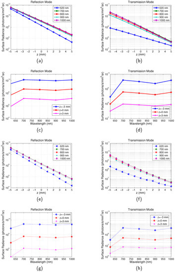 The averaged surface radiance of all the pixels across the surface for full-field illumination system and scanning system is shown in Figure 5. The surface radiance is calculated as a function of the depth of the target z in the range between mm and 5 mm with a step of 1 mm and emission wavelength in the range between 620 nm and 1000 nm. From Figure 5a,b, it can be seen that with increase of z, the surface radiance for both the reflection and transmission mode decreases. This is due to the increased distance between the illumination source and the targets. Longer distance means that more excitation photons are absorbed or scattered along the path and therefore less excitation light reaches the targets. It is also found that the depth change has greater influence on reflection than transmission. For example, for the imaging with the scanning system and at the emission wavelength of 700 nm, the surface radiance decreased times for the reflection mode and times for the transmission mode. This can be understood that the photon density of the excitation light is higher near the incident boundary. Similar results were observed in [28]. The dependence of the surface radiance on wavelength is shown in Figure 5c,d. It can be seen that it is in accordance with the change of with the emission wavelength ( at ; at ; at ; at ; at ). From to 900 nm increases leading to a decreased surface radiance. From to 1000 nm, decreases leading to an increased surface radiance. However these are much smaller effects compared to the effect of z.