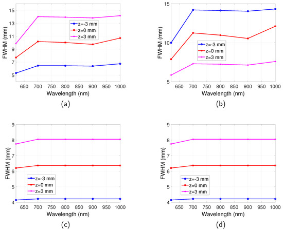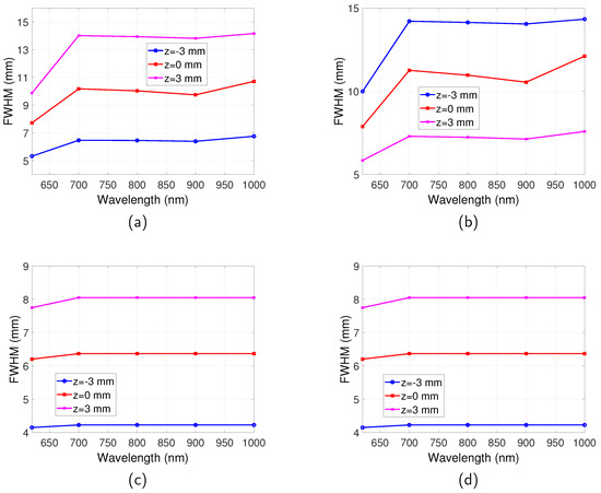 Spatial resolution for full-field illumination system and scanning system as a function of wavelength. Optical properties are the same as those indicated by Figure 2. Separation between the two targets is . . (a) FWHM vs. for full-illumination system in reflection mode. (b) FWHM vs. for full-illumination system in transmission mode. (c) FWHM vs. for scanning system in reflection mode. (d) FWHM vs. for scanning system in transmission mode.