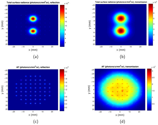 Maps of surface radiance considering autofluorescence at excitation wavelength of . z = mm. Separation between the two QDs regions is . (a) Total surface radiance in reflection mode; (b) total surface radiance in transmission mode; (c) surface radiance for only autofluorescence in reflection mode; and (d) surface radiance for only autofluorescence in transmission mode. AF: autofluorescence.
