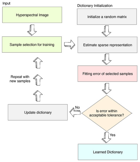 The focus of this paper is twofold: (i) To enhance the quality of HSI scene reconstruction through a robust dictionary learning method. (ii) To reduce the computational complexity of dictionary learning process. The paper reports a strategic dictionary learning through an unsupervised clustering method (K-Means [14,15]) as a preprocessing step in addition to an advanced basis pursuit algorithm (orthogonal matching pursuit (OMP)) for HSI scene reconstructions. The scene reconstruction capability of the proposed method is validated by using several publicly available data sets, which are then compared with that of other spectral unmixing techniques. The paper is structured as follows. Section 1 highlights the problem statement and outlines the main objective of the present work. In Section 2, we outline the background and shortcomings of previous work. Section 3 includes a description of the proposed algorithm. Section 4 outlines the data sets that have been utilised in this work and the scene reconstruction assessment metrics. Section 5 contains the experimental results obtained by the proposed method together with that of the competing algorithms and Section 6 contains the discussion and conclusions.
