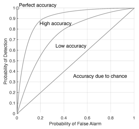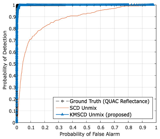 The detectability of the target is presented in a receiver operating characteristics (ROC), which plots the positive–positive versus the positive–negative, and an example of the ROC is illustrated in Figure 2. The locations of targets (i.e., the target map) is noted from the ground truth data set (i.e., the Selene ground truth data in this paper). The ROC of the target is constructed by using the scores given by ACE detection of the target in the reconstructed scene, and it is then constructed using the target map information to indicate the faithfulness of the detection.