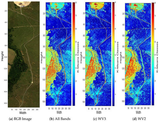 False-colour classification maps displayed with all 448 bands (b), 16 centre wavelengths of the WV3 sensor (c) and 8 centre wavelengths of the WV2 sensor (d) classified by K-Means for H23 Dual scene into 80 classes with MATLAB’s default maximum of 100 iterations. The figures show >99% of classification similarities despite of the very small number of spectral bands (8 bands) that has been utilised in (d).