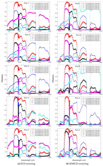 Most abundant endmembers (EMs) for the for five runs with 40 EMs between (a) SCD-unmixing with random sample selection and (b) the proposed K-Means SCD algorithm (KMSCD) unmixing.