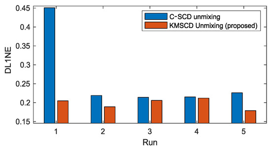 The robustness of the C-SCD and the KMSCD algorithms is further examined through their reproducibility of scene reconstructions over the repeated five runs. Figure 5 plots the mean of the DL1NE error given by the C-SCD and KMSCD algorithms. Over the five runs, the mean errors and standard deviations (std) of the C-SCD and KMSCD are, respectively, 0.32% ± 0.057% and 0.24% ± 0.027%. The STD of the KMSCD over the five runs exhibit roughly halve of that by C-SCD, further showing the much better robustness of the proposed KMSCD method in comparison to the C-SCD.