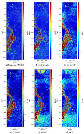 This section presents the main results of this paper, and the first focus is to verify the effectiveness of the scene reconstruction for the background materials in the scene. Subsequently, the ability of the DL algorithms to reconstruct trace materials is presented in the next section (Section 5.3). Figure 6 shows the DL1NE (i.e., the differential -norm of the reconstructed vector w.r.t. that of the ground truth) false-colour map of the Selene Dual scene reconstructed by the proposed KMSCD (i.e., the Algorithm 1) and also by other competing algorithms. The data input in all cases was the Selene Dual 448 band data set and the sizes of the dictionary to be learnt were fixed at M = 50. In the classification, a cluster is ideally assumed to be a candidate material on its own. We substituted random sample selection and forced KMSCD to select one sample from each cluster. The DL for all methods was performed using the first 1000 lines (approximately half of the scene). The result of the reconstruction presented in Figure 6 is in false colour, and, to visualise the consistency of the reconstruction performance over the entire scene among all competing methods, all results have been presented to show errors up to a maximum of 3 times of the mean of the DL1NE error over the entire scene. For example, the colour patterns in Figure 6a,b are very similar: both exhibit high errors (in red) in the tree areas, whereas good reconstructions (i.e., blue colour) are seen over the glass and the concrete slab in the scene. The differences between these two, are that the proposed KMSCD result (Figure 6a) gives a mean of the DL1NE of 0.28% over the entire scene, which is ~40% better of the reconstruction accuracy than that of the C-SCD (Figure 6b). These two figures also highlight the more superiority in the proposed KMSCD for the reconstruction of the most abundant material in the scene (i.e., the grass) over the C-SCD method: the whole scene apart from the tree area are all in very low error <0.2% (in blue colour), and it can only be seen from the KMSCD result. Over the five data sets employed in this study, it is seen from Table 2 that the proposed KMSCD is capable of reconstructing these scenes with the lowest error over all competing algorithms that have been adopted in this research. Similar to Table 3, Table 4 tabulates the mean of the MD error of the entire scene for various data sets that have been employed in this work. Table 4 is the same as Table 3, but the mean(MD/band) has been tabulated so to allow direct comparisons between data sets that may have a differing number of spectral bands.