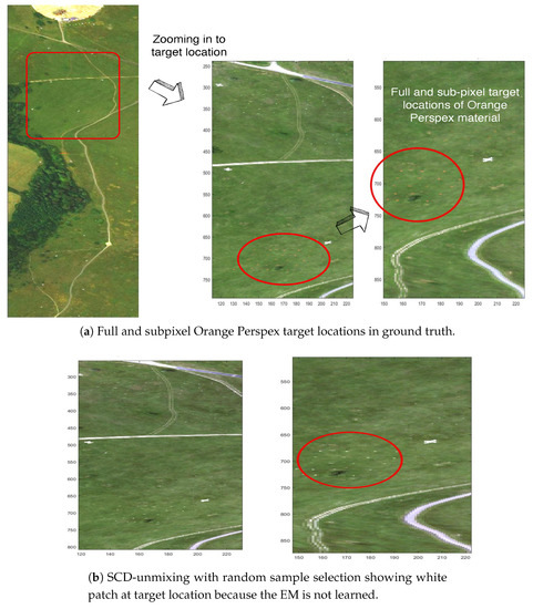 This section describes the abilities of the DL algorithms, precisely, the C-SCD and the proposed KMSCD algorithms, for the reconstruction of trace materials in the scene. There is a small amount (~1 of whole scene) of full-pixel (i.e., material occupancy = 1) artificial materials embedded in the Selene scene, and their presence in the scene are depicted in the RGB image as shown in Figure 7a. A number of small Orange Perspex panels with dimensions of approximately 40 × 40 cm, deployed in the scene as targets, are used here to testify the ability of the DL algorithms for their recoveries. Due to the random selection of pixels strategy adopted for the DL in the C-SCD algorithm, the recovery of the Orange Perspex targets by the C-SCD is seen to fail as shown in Figure 7b. In contrast, these Orange Perspex targets have been successfully recovered by the proposed KMSCD, as shown in Figure 7c.