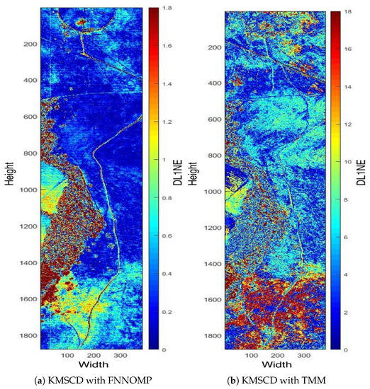 The TMM technique [26] has been used extensively in the HSI simulator (e.g., the CameoSim package) [32,33,34], which estimates the abundances by evaluating the inverse of the Euclidean distances of each EM with respect to the spectral characteristics of the mixed pixel, i.e., the test pixel. Note that the results that have been presented in Section 5.2.2 are the reconstructions that have been processed without the limitation on the . Figure 10 depicts the false-colour DL1NE map of the Selene Dual scene reconstructed by Algorithm 2 (Figure 10a) and the TMM (Figure 10b) using a maximum of four materials () in every pixel. The mean DL1NE error of the whole scene for the reconstruction by Algorithm 2 is found to be 0.74%, which is more than 2 times higher than that of the Algorithm 1 (i.e., the KMSCD without restriction). Furthermore, the mean DL1NE of the reconstruction that constrained by the TMM exhibits 7.12% error, which is ~10 orders of magnitude higher than that of Algorithm 2. Figure 11 plots the ROC for the detection of the Orange Perspex target from these two scenes by the ACE detector, and the AUC of the Algorithm 2 shows approximately twice as that of the one constrained by TMM. The combined results of these two figures may suggest that the proposed DL method using KMSCD and, together with the FNNOMP, will be more suitable for HSI scene simulators like the CameoSim as the material allocation method for practical HSI scene simulation applications.