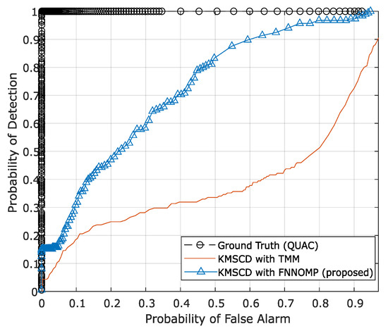 To quantify the ability of the DL algorithms for the retrieval of these small targets, the receiver operating characteristic (ROC) for the detection of the Orange Perspex from the Selene Dual scene, reconstructed by C-SCD and the KMSCD for the same run shown previously with 50 EMs, are shown in Figure 8. It is seen quite clearly from the ROC curve that the Orange Perspex targets have been ~12% better detected by the KMSCD than that from the C-SCD data, as according to the conventional assessment method using the aura under the curve (AUC) metric for assessing the detection capability quantitatively.