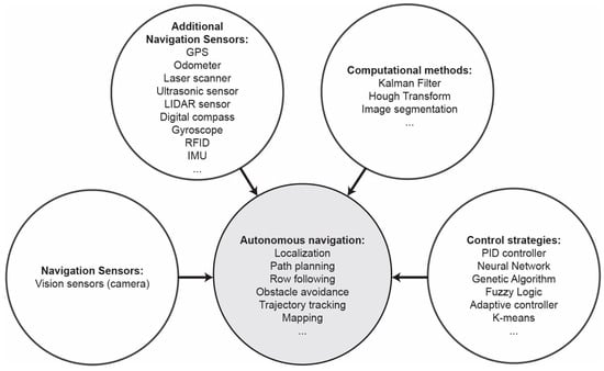 Machine vision is used complimentary to GPS and sensors in order to enhance the precision of navigation. When crop row structure is distinct in a field, machine vision can be implemented to automatically guide a vehicle in the field. On one hand, the guiding sensor (camera) is only local, since it reveals information regarding the relative location of the vehicle. On the other hand, the use of local features can be used to fine-tune the vehicle navigation course [88]. Machine vision provides the technological characteristics to simulate the eyes of a human operator, thus, has a great potential in navigation systems [89]. The problem of navigation in plant structures is the fact that harvesting or mowing changes the scene of the lines of the field. In most of the cases, though, the plants grow in rows, producing a natural set of lines, which define the image, thus making the processing more distinct. In general, autonomous navigation systems for agricultural mobile robot consists of navigation sensors, computational methods, and navigation control strategies. Figure 1 presents the aforementioned basic elements.