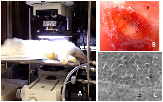 The image shows the experimental setup and the phases to create the pleural window. (A) the placement of the animal under the microscope; (B) shows the external intercostal layer (a), the internal intercostal layer (b), and the denuded parietal pleura (c); (C) shows the portion of the stripped parietal pleura (c1) so as to create the “pleural window”, allowing a neat view of the underlying lung surface (note the difference with the unstripped portion c2). The figure is free of ethical problems and the experimental setup shown is unprotected for publication.