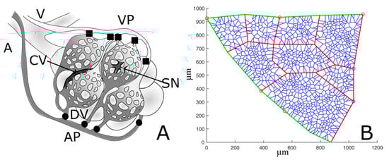 (A) simplified schema of lung alveolar capillary units. The arteriole (A) feeds the distribution vessels (DVs) and the arteriolar access points (APs) to the alveolar unit; blood flows into the two districts placed in parallel, the septal network (SN) and the corners vessels (CVs), and finally collects through the venular exit points (VPs) into the venule (V). (B) Representative example of an ACU network. Green and red segments represent respectively distribution vessels and corner vessels, while the remaining blue network depicts septal circulation. Red and blue circles identify respectively arteriolar access points and venular exit points.