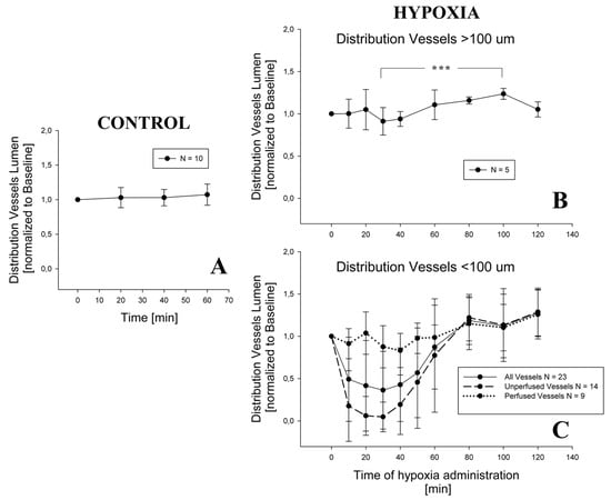 Change in distribution vessels diameter in control condition (Panel A) and during hypoxia exposure, both for vessels having a diameter > 100 μm (Panel B) and for the smaller ones (Panel C). For graphical reasons, the statistical significance is shown only in Panel B (*** = p < 0,001), while for Panel C see the text. In Panel C, time patterns are shown for distribution vessels that remain patent during the experiment and for those which close at least at one time point.