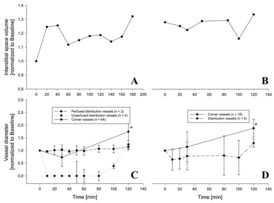Change of interstitial space volume during hypoxia exposure for 2 different rabbits (Panels A,B) and the relative change in diameter of distribution and corner vessels (Panels C,D). In Panel C, distribution vessels have a diameter less than 100 μm and are distinguished among those which were always perfused and those which were closed at some timepoint. In Panel C, at all timepoints from 10 up to 100 min, the diameter was significantly decreased relative to baseline for the unperfused distribution vessels (p< 0.001). The diameter of corner vessels steadily increased (* = p < 0.05).