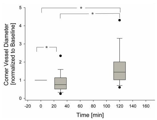 Change of corner vessel diameters over time, during hypoxia exposure (120 observations), (* = p < 0.05).