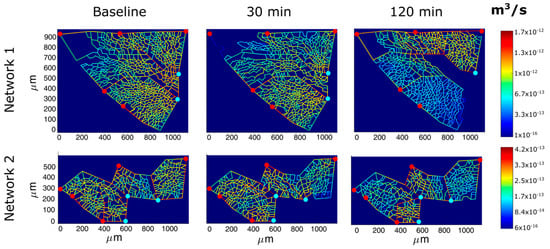 Results of perfusion analysis for two different ACU regions. Red and light blue dots identify respectively arteriolar accesses and venular exits. The color panels show ACU capillary blood flow at different time points (baseline, 30, and 120 min of hypoxia exposure) with color-coded log-scale intensity.