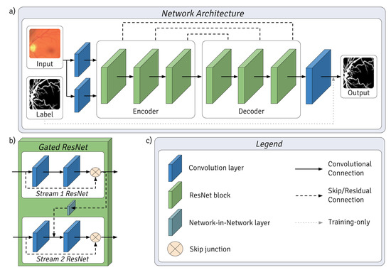 PixelBNN is a fully-residual autoencoder with gated residual streams, each initialized by differing convolutional filters. It is based on UNET [33], PixelCNN [15] as well as various work on the use of skip connections and batch normalization within fully convolutional networks [17,18,19,34]. Figure 1a illustrates the architecture of the proposed method, whereby processed image patches were passed through two convolution layers with different filters to create parallel input streams for the encoder. Convolutional downsampling occurred between each ResNet block in the encoder and deconvolutional upsampling in the decoder. Each gated ResNet block consisted of four gated ResNets, each of which had an architecture as shown in Figure 1b. Each gated ResNet was made up of convolution layers with kernel size 3 and stride of 1. Stream 1 ResNet was gated with Stream 2 by a network-in-network (NIN) layer—which is a 1 × 1 convolutional layer like those found in Inception models [20]—which concatenated the output features from the first steam with those of the second. PixelBNN utilized convolutional downsampling with a stride of 2, as well as long and short skip connections. Each gated ResNet in the encoder had a skip connection to a paired Gated ResNet in the decoder. Dropout was applied to outbound connections of each gated ResNet during downsampling. The output was a vessel mask of equal size to the input. The label is used to train the network, specifically to calculate the loss of the generated vessel mask.