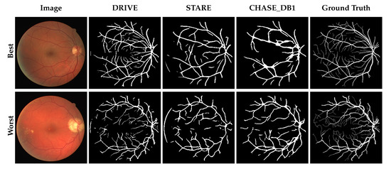 Network predictions on the DRIVE dataset. The top row shows the image, segmentation masks and ground truth for the image that scored best when DRIVE was used to train and test the model; the bottom row shows the worst. For comparison, the cross-validation results from training the model with STARE and CHASE_DB1 are shown.