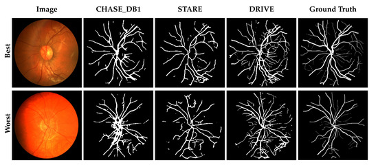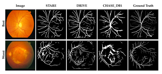 Network predictions on the STARE dataset. The top row shows the image, segmentation masks and ground truth for the image that scored best when STARE was used to train and test the model; the bottom row shows the worst. For comparison, the cross-validation results from training the model with DRIVE and CHASE_DB1 are shown.
