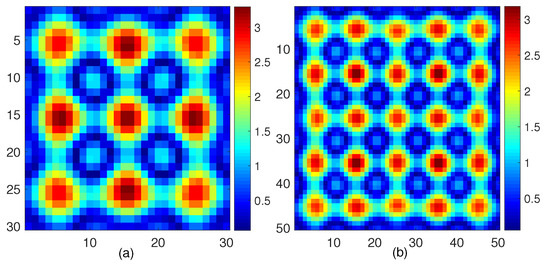 where , is the contrast at , whereas and are the incident electric field and the induced current at , respectively. Subscript denotes the x, y, and z components of a vector. Note that the convolution-type operators are obtained via the Equation (4). For further details of the discretization of Equation (1) and the finite difference scheme to generate , please refer to the Appendix of [6].