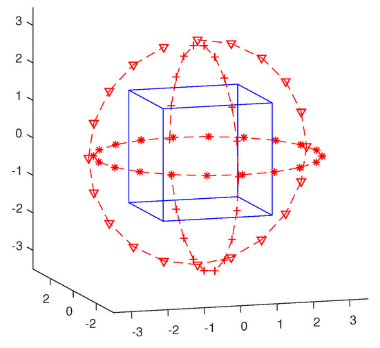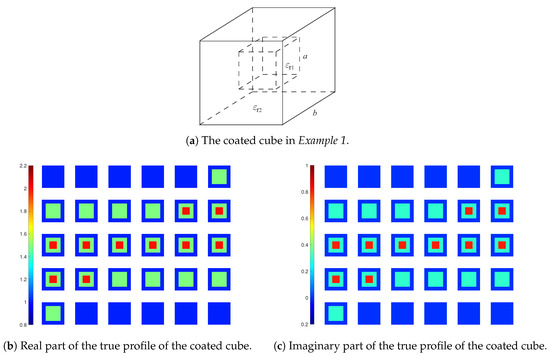 We will use another highly nonlinear example to confirm the large difference between the performances of inversion methods with CIE-I and LSIE. In this example, we use a profile that is similar to the famous two-dimensional “Austria” that has an annular and two separated disks. Here, we use a coated cube with a hollow inside and two rods outside the cube, as shown in Figure 11, all of which are with .