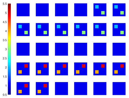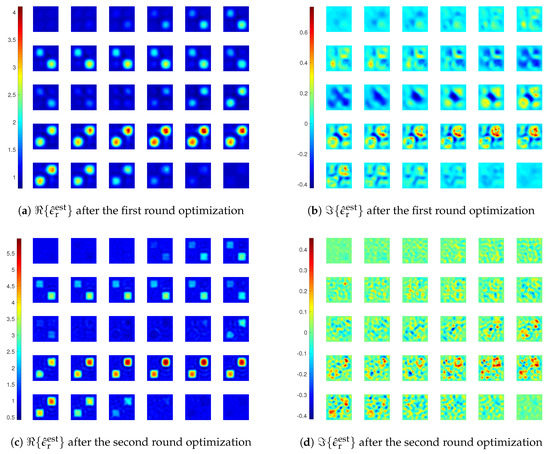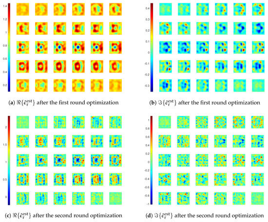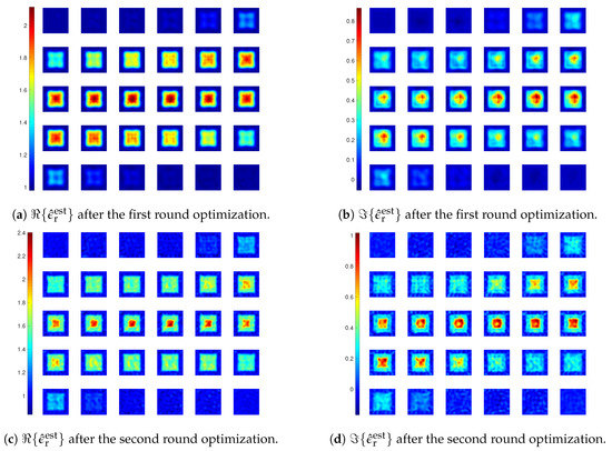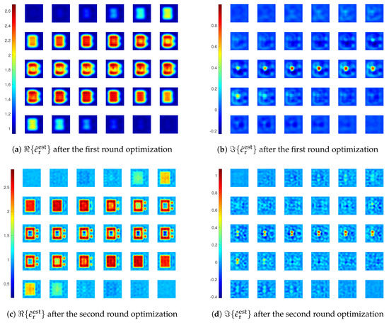 Reconstruction results of inversions with CIE-I. In the four subfigures, the 30 slices of DoI with each at plane, where , , are the grid points along z-direction, and if . The displaying sequence is with the convention of left to right, and top to down. For instance, the top left corner one is with , and the top row second column one is with . The same applies to the figures hereafter. In the first round, . In the second round, .