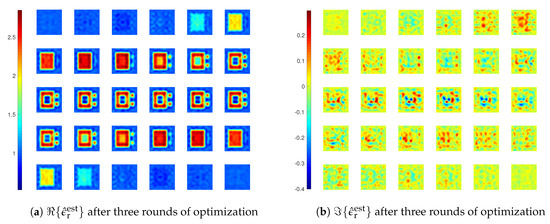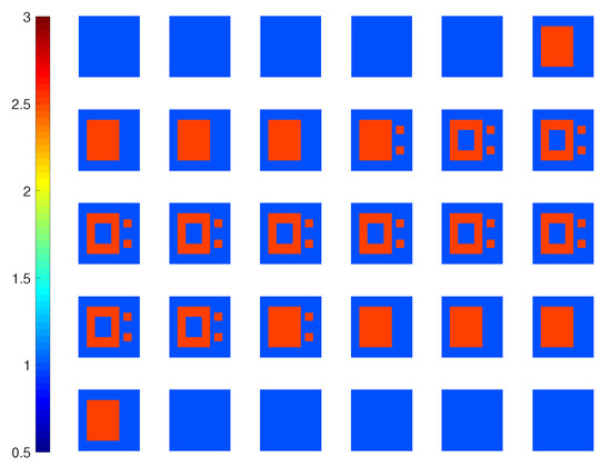 In the reconstruction results in Figure 14, we see that there is an artefact within the coated cube, where the medium is supposed to be air. This artefact appears in the reconstructed result after the first round optimization with , meaning that the inversion, though capable of retrieving most of the main features of the scatterers, is still not stable enough. Therefore, we carry out another inversion with three rounds of optimization, with , 8, and 10 in each round, and , 1, and , respectively. The final reconstruction result is given in Figure 15, and we see that there is no more such an artefact.